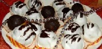 1 hrnek ovesných vloček, 2 hrsti piškotů, 1 lžíce medu, 1,5 lžíce kokosu, 1,5 lžíce granka, 1 dcl vaječného koňaku, 40 g rozpuštěného másla, 75 g čokolády na polevu. Vločky nasucho opražíme a rozmixujeme, piškoty rozmixujeme a přidáme ostatní suroviny.Propracujeme a pokud je potřeba přidáme ještě kokos. Uděláme koule, obalíme v čokoládové polevě a necháme ztuhnout na mřížce. Pak polovinu koulí obalíme v bílém fondánu a ozdobíme čokoládou. Necháme ztuhnout v ledničce.