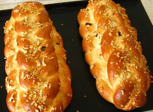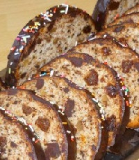 2 lžíce vody, lžíce ovoce (kandovaného nebo sušeného), 3 lžíce ořechů (sekaných), 3 lžíce rozinek, 4 bílky, 12 dkg moučkového cukru, 12 dkg polohrubé mouky, 6 dkg másla. Ušleháme tuhý sníh s vodou, po částech zašleháme cukr až hmota ztuhne, vařečkou lehce vmícháme rozpuštěné,vlažné máslo a ovoce s ořechy obalené v mouce, vlijeme do chlebíčkové...